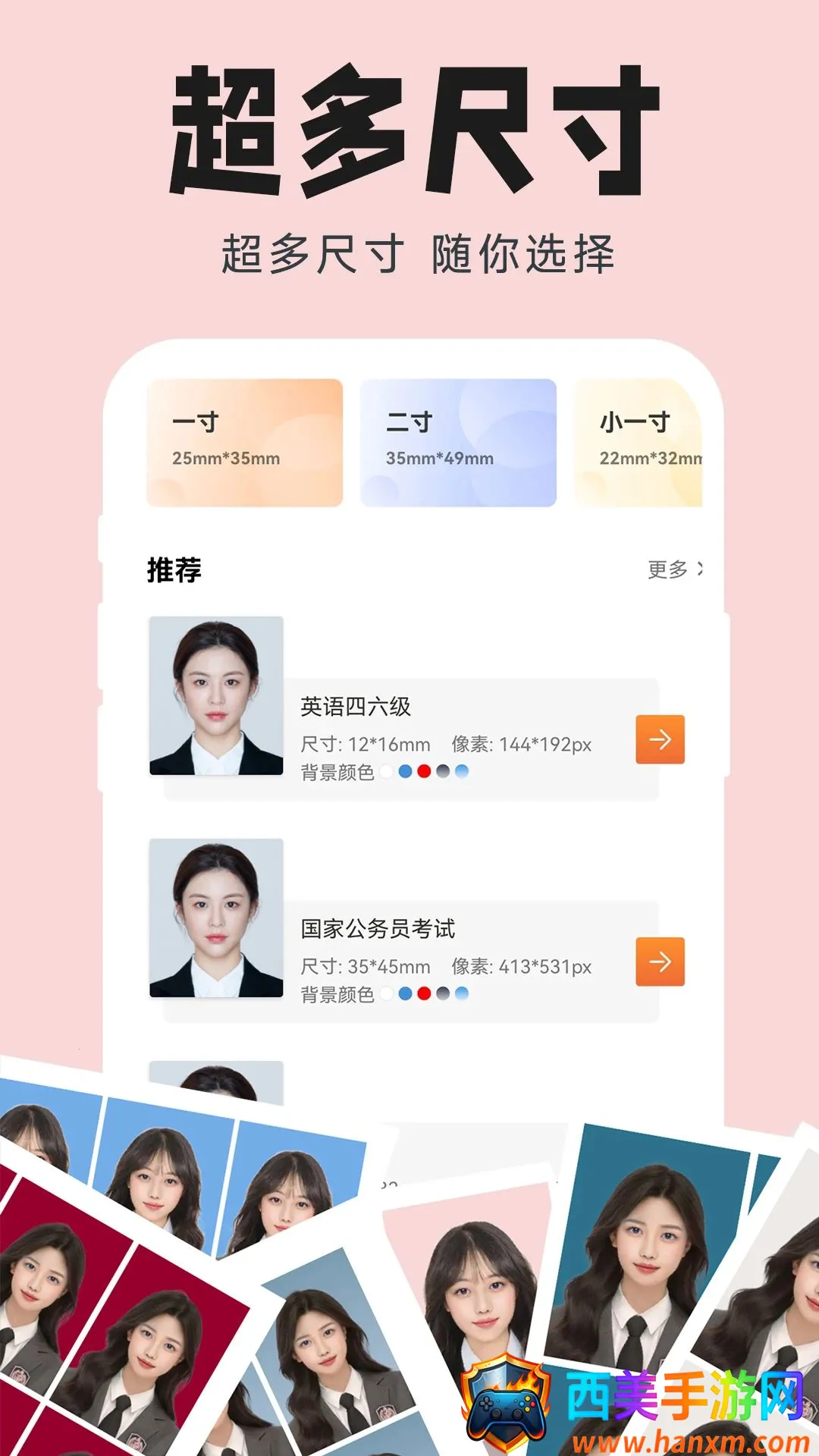 4、支持多种尺寸模板选择,可满足多种类型证件照的需求,涵盖国内外各种证件照格式,还能自定义背景颜色和尺寸规格。