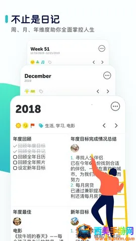 4. 多维度记录与复盘:基于积极心理学的写作引导库,还有日周月年多维度,能帮用户在不同时间维度复盘规划,实现人生目标,还可选择多种主题模板并定制。