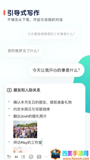 1. 独特问答回顾方式:与其他日记不同,它将一天分成若干问题格子,通过回答记录重要事件与体会,能更直接有效地反观自己,解决不知从何写起的困扰。
