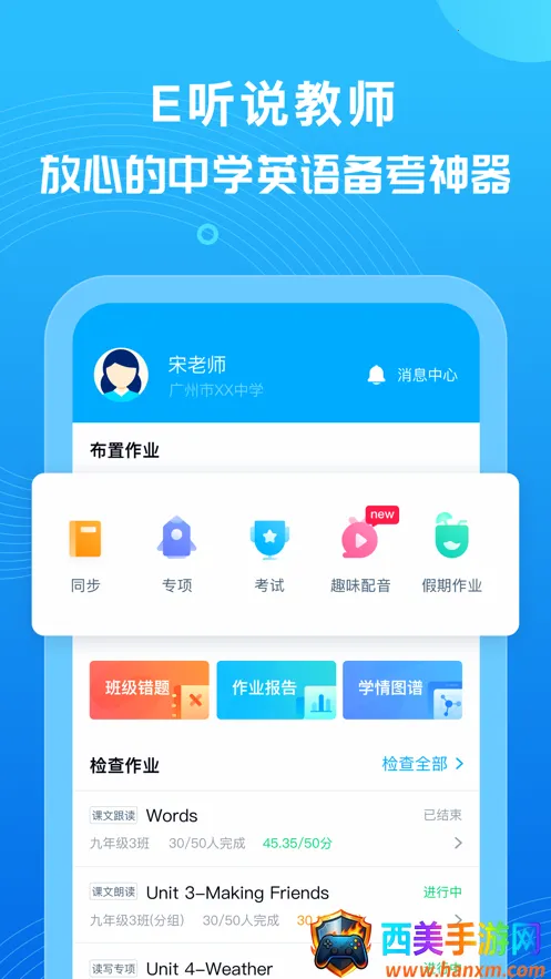 E 听说教师是专为教师设计的英语教学管理软件,简化教学流程,提供丰富资源。有智能评测、海量同步练习和测试资源,涵盖多方面功能,能助力教师提升教学质量,轻松管理班级与教学。
