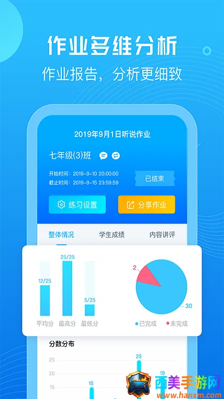 2. 智能批改作文:学生手写作文拍照上传,人工智能多维度自动打分,支持老师一键语音点评,逐句批改,智能分析,掌握班级学情动态。