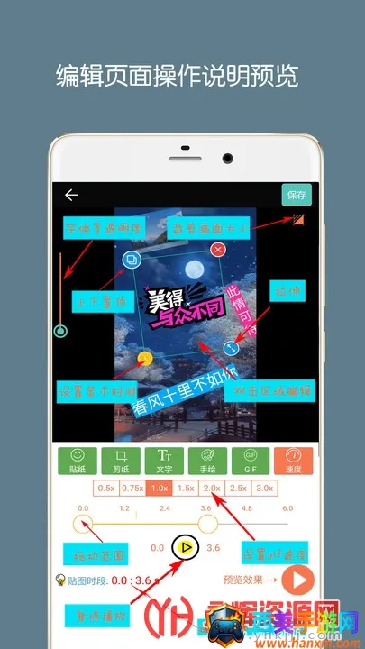2. **功能丰富多样**:可进行视频剪辑,截取重要部分添加表情文字;能将图片转GIF并智能优化大小;支持视频剪切,随意选取、快进快退预览,还能剪切长度和部分画面;可添加任意数量文字贴纸,实现画中画效果,设置贴图文字显示时间等。