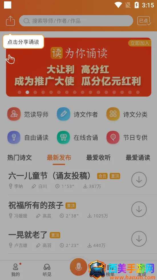 2. 丰富多样的诵读内容,涵盖名家名作、古今诗文、心灵鸡汤等,满足你的阅读需求。