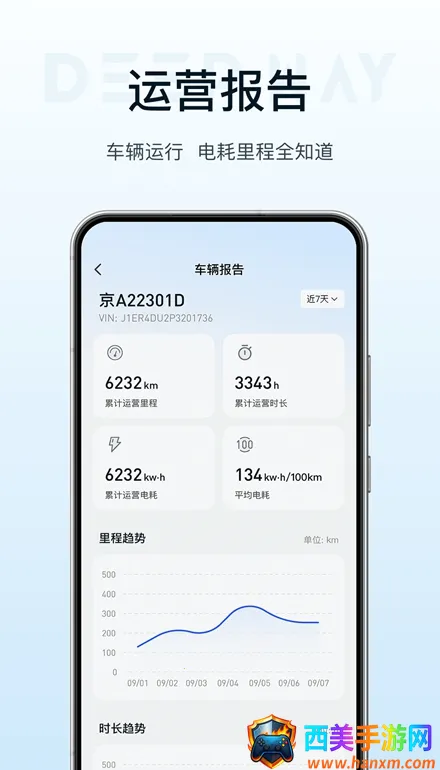 4. 车辆信息全掌握:在这里能查看各个方面的数据报告内容,了解车辆运行情况,还可查看电池电量等信息,掌握车辆耗电及运用时长。