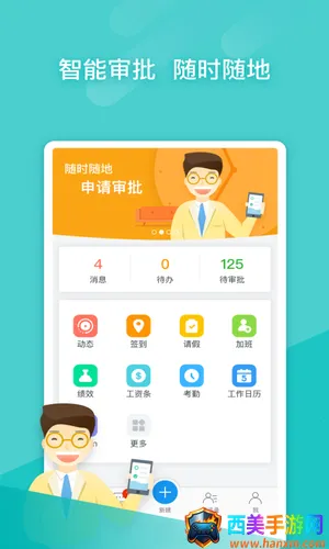 便捷移动办公:支持移动办公,可快速查看工作待办、审批、绩效等消息通知,多端提醒;有移动审批中心,能便捷发起和处理工作审批;移动签到可一手掌控日常考勤与销售外勤管理。