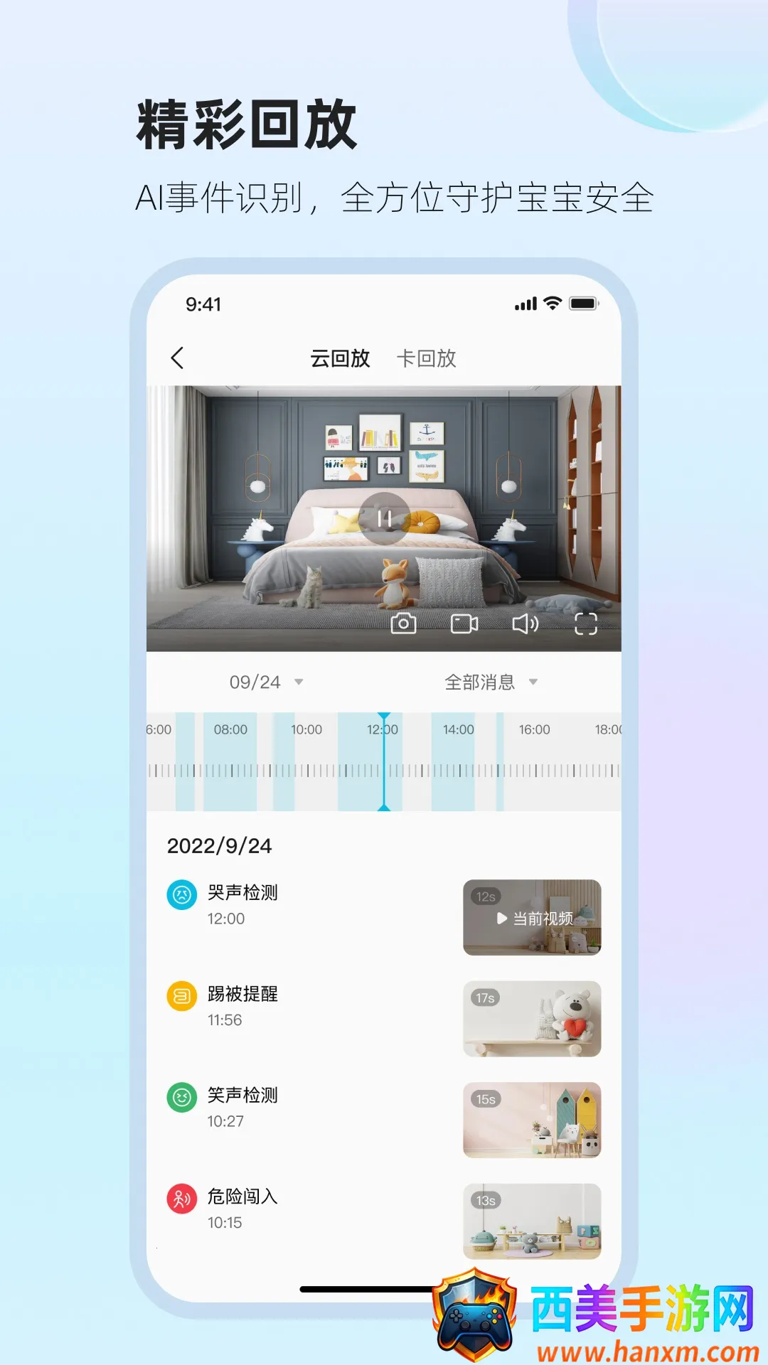 4. 高清抓拍,随时查看回放:能进行室内室外高清视频成长自动抓拍,通过视频回放功能,让父母更清晰了解宝宝成长历程。