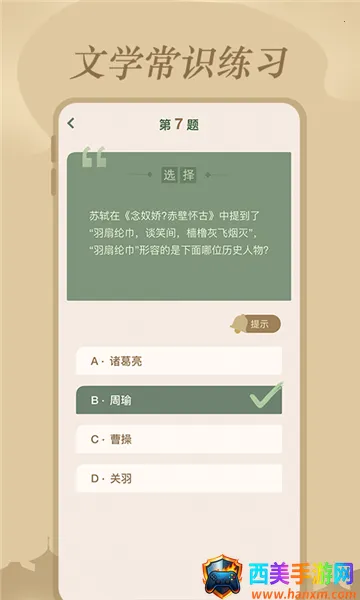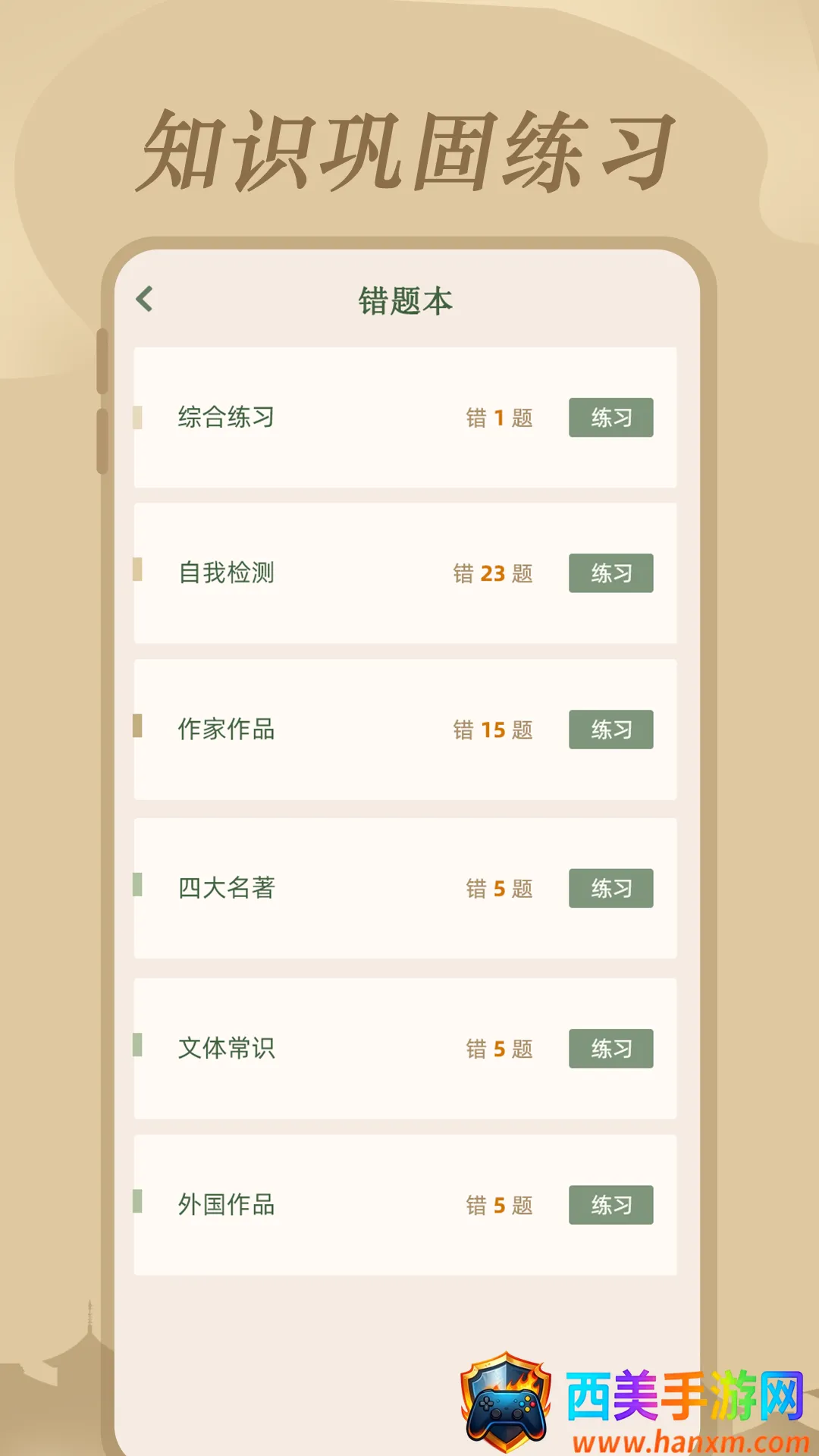 想轻松掌握文学常识?那这款文学常识app绝对适合你!它有1000题含答案,能满足你的需求。软件对文学常识分类超细致,像四大名著、古今名家、民间故事、古代文化、外国文学等,方便你针对性学习。还有个性化学习功能,依据你的进度和理解程度定制专属计划。趣味互动模式,把枯燥的学习变得有趣,比如知识能量卡适合亲子、朋友聚会时玩。全面题库覆盖各类题目,满足不同层次需求。自我检测栏目能限时练习,错题自动进错题本方便巩固,收藏本可收藏重点题目。还有打印功能,能脱离屏幕做笔试训练。更新内容不断优化体验。在这里,你能随时随地探索文学魅力,深入了解文学常识,轻松提升文学素养。