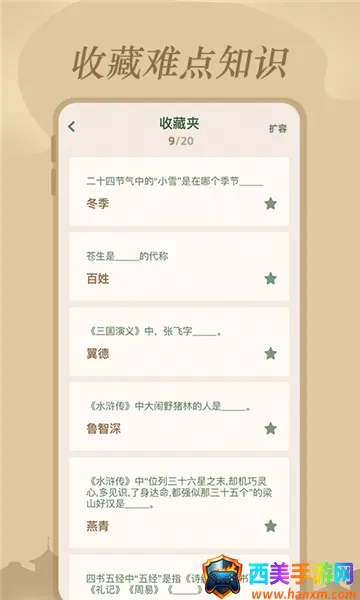 1. 分类丰富:对文学常识进行四大分类,包括四大名著、古今名家、民间故事、古代文化、外国文学等,方便用户针对性学习。