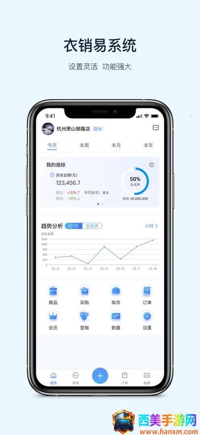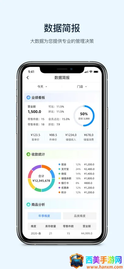 2. 数据统计清晰:能实时更新门店商品销售业绩数据,高效管理汇总销售交易记录,对账方便,盈利清晰。还可查看店铺每天实收金额、目标达成率,以及商品的季度销售量、营业额等,了解热销程度,掌握门店经营状况。