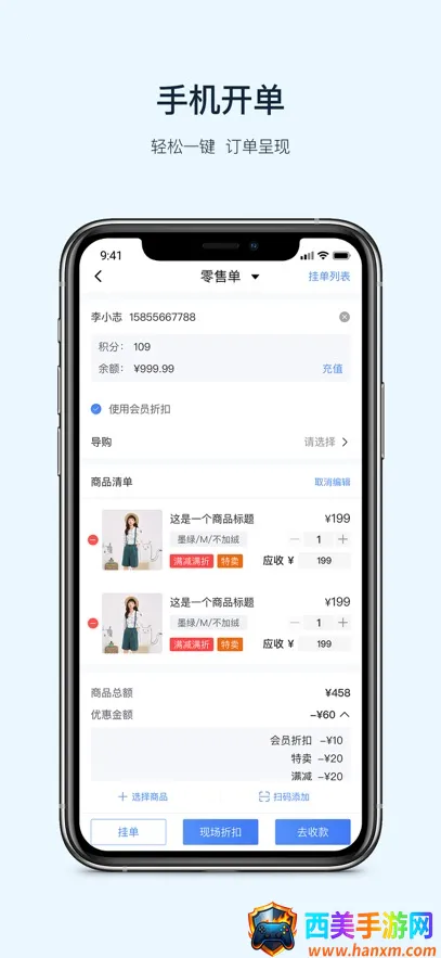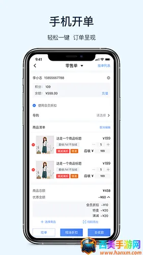 3. 操作功能丰富:支持商品在线管理,可新增、下架商品;一键扫码收款,出示收款码或扫一扫均可;及时处理退货;能管理库存并查询任意商品库存量;支持手机开单收款;手动或扫码录入商品信息;图文组合智慧收银;可群发优惠券给会员;随时展开数据看板了解销售业绩;及时在线采购货源,处理进销存订单;及时处理退款订单等。