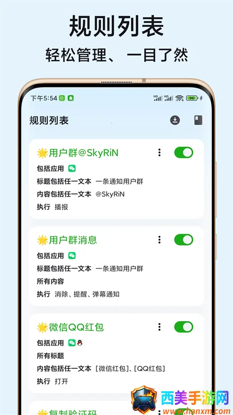 一款好用的手机通知管理工具,能轻松管理各种通知信息。每个 app 可单独编辑,还能查看全部详情。解锁全部 vip 功能,管理和设置更轻松方便,满足个性化需求。通知样式及是否添加音乐都能选择。能记录长达 90 天的通知匹配历史,详细记录通知信息与执行记录。多种导入导出及分享途径,还有 14 种强大执行模式,如播报通知、替换铃声等,可自由组合执行模式,定制适合自己的规则,快速准确匹配通知,提升管理效率,让手机更智能。