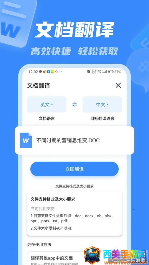 软件亮点也很多,准确翻译,拍照翻译结果精确;极速翻译,速度迅猛几乎即时完成;一键照亮,光线不足也能清晰捕捉文字;文件管理方便查看翻译结果;完整备份可随时查阅记录;高清扫描确保信息准确。它支持 60 多种语言,多种翻译方式齐全,智能扫描识别超省心,还能自动识别文字、自由切换语言,联网就能实时在线翻译,真的超便利!