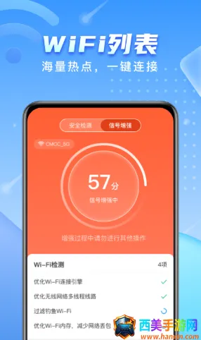 2. 网络优化:提供多种网络测速方式,具备智能wifi扫描、加速功能,可选择信号增强方式,帮助获得更流畅网络,玩游戏不卡顿。