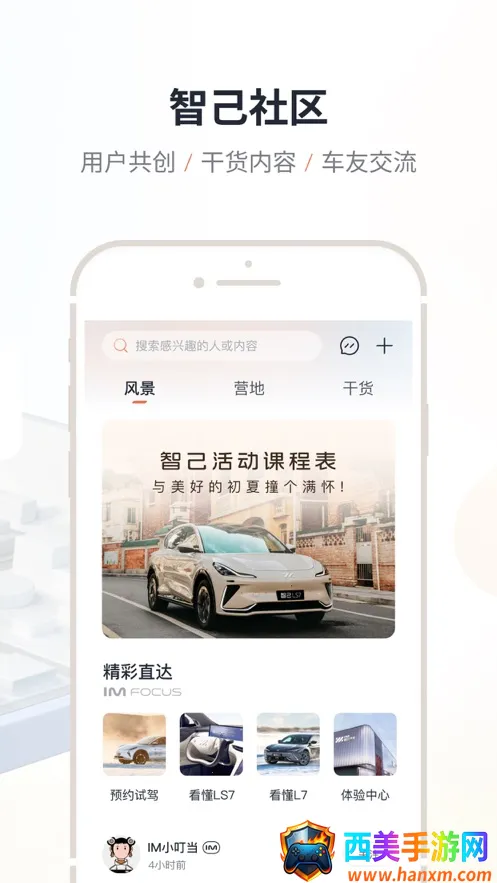 IM智己是一个充满活力与创新的汽车品牌平台。它由上汽集团、张江高科和阿里巴巴集团共同打造,成立于2020年12月25日。其官方app为用户提供了丰富多样的汽车服务。在这里,用户能加入不同圈子,结识各种爱车伙伴,与志同道合的人在线交流汽车资讯、车展动态等。还能在社区分享经验、学习汽车知识。购车用户基于日常用车产生的数据可获取原石,通过原石开采等方式获得车主权益。此外,软件不断更新优化,功能持续完善,为用户带来更好的体验。IM智己致力于为用户打造一个集交流、学习、体验为一体的智能汽车服务平台,让用户深度体验汽车带来的便利和乐趣,加强品牌与用户的紧密联系。