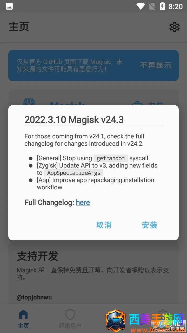 Magisk面具的最新版是一款功能强大的工具,它能迅速实现一键Root,解锁手机高级权限,同时提供丰富的自定义选项,大幅提升手机功能与灵活性。用户可轻松安装多种模块,为设备增添众多新功能与服务,让手机更加个性化和高效。无论是系统性能优化隐私保护增强,还是启动动画定制,Magisk面具都能全方位满足您的个性化需求。该软件运行内存占用极小,支持本地下载,无需额外下载其他包体,节省存储空间。作为100开源项目,它易于在所有Google支持的平台上构建和定制,确保了透明度与社区贡献的可能性。能够在不篡改系统分区的情况下对设备进行root权限管理,保证了系统的稳定性和安全性。提供后台进程优化通知栏美化以及UI定制等功能,提升用户体验。用户可以根据自身需求调整设置,以提高手机的整体性能,实用性强。通过类似墓碑机制的方式管理后台应用,减少不必要的CPU活跃度,延长电池寿命。一款功能强大的安卓设备Root解决方案,使您的手机操作更加灵活多变。即使您担心Root带来的风险,Magisk也提供了安全可靠的方式让您放心体验Root带来的便利。可以在不对系统文件做直接修改的前提下完成Root操作,保障了系统的原生纯净度。
