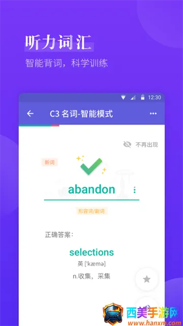 2. 智能高效学习:能根据使用者词汇量和复习结果动态调整单词顺序及难易程度,考满分语料库有智能模式,背词效率高,还会根据记忆曲线反复出现拼错单词,直到拼对。