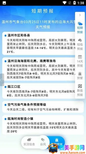 温州市台风网是一款非常实用的气象服务软件。它由温州市气象局官方打造,权威可靠。能实时追踪西北太平洋活跃台风路径,查看未来7天动态预测,还可回溯历史轨迹。覆盖温州本地及东南沿海地区,为安全出行与防灾决策提供依据。