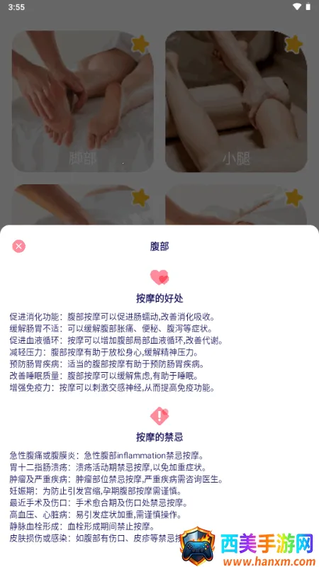 这款软件好处多多,能促进消化功能,缓解肠胃不适,促进血液循环,减轻压力,预防肠胃疾病,改善睡眠质量,增强免疫力。但按摩也有禁忌,急性腹痛、胃十二指肠溃疡活动期、肿瘤部位、妊娠期、最近手术及伤口处、高血压心脏病、静脉血栓形成、皮肤损伤或感染时要谨慎。软件还会不断更新修复问题,提升体验。快来下载,开启属于你的按摩放松时光吧!