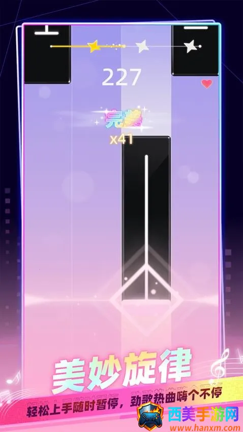 《我是音乐家》是一款极具特色的游戏。它拥有海量正版授权曲库,涵盖多种风格且每周更新。其画面采用高清二维与先进色彩渲染技术,背景简洁,方块皮肤炫酷。创新的彩色格子替代音符,避免视觉疲劳还增强了节奏感。音符下落速度与点击频率关联,对手速和反应力要求高。进程中能解锁个性化主题皮肤。内设曲目查看功能,音符下落速度递增,需仔细聆听旋律把握节奏。曲库丰富,每首歌都有独特操作难题。支持离线畅玩,通过简单操作消除方块,还有个性化皮肤设计系统和高燃练习模式。能让玩家尽情享受音乐,挑战自我,沉浸其中。