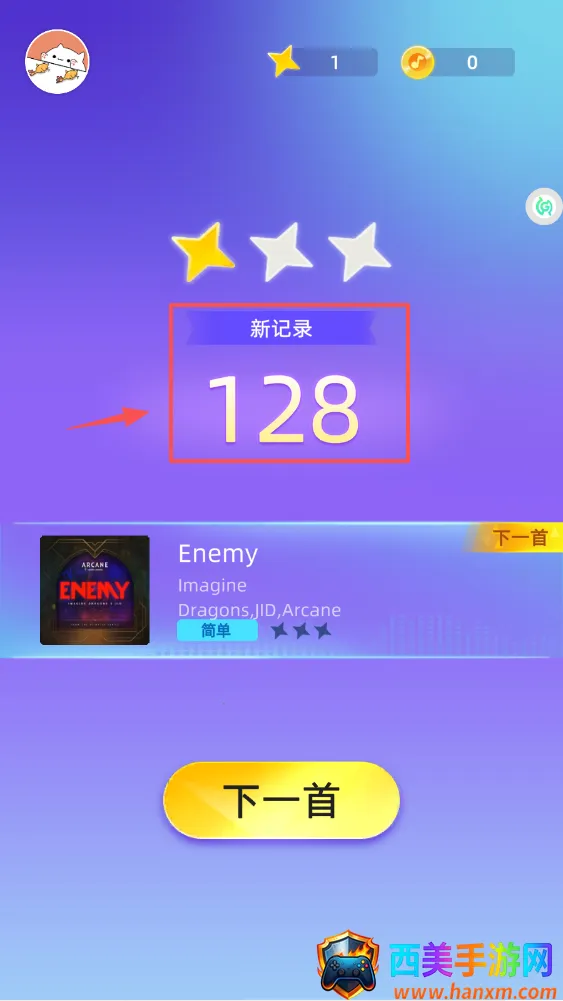 4、每局结束记得查看得分界面,破纪录会有蓝色标签,攒够星星还能解锁新曲目,用下一首按钮继续挑战吧。