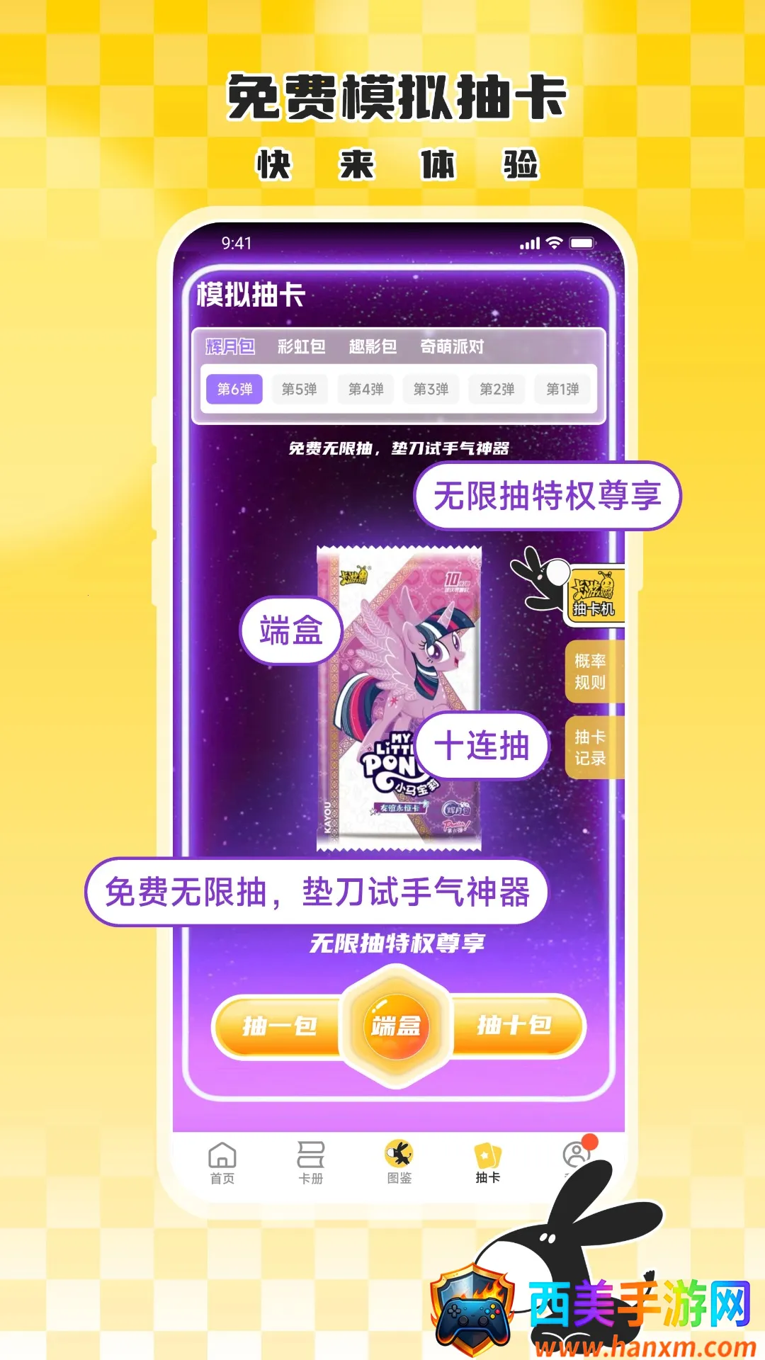 大黑驴卡牌是一款超棒的卡牌社区APP,专为卡牌爱好者打造。在这里,你可以尽情享受无限抽卡的乐趣,想抽多少抽多少,特别过瘾!里面有好多热门动漫的卡牌,像小马宝莉、海绵宝宝等都能收集,慢慢攒齐喜欢的角色超有成就感。
