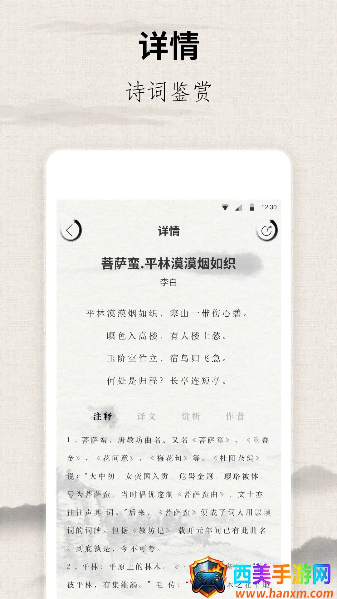 想拥有宋词三百首电子版pdf吗?有这样一款软件能满足你的需求。它精心挑选了宋代最具代表性的词作,像苏轼、李清照、辛弃疾等名家名篇都涵盖其中。提供原文与注释相结合的内容,帮你轻松理解词意及背景。支持多种阅读模式,白天模式和夜间模式随意切换,满足不同场景需求。还有内置朗读功能,能让你选择听书模式,感受词作的韵律之美。它界面设计古朴典雅,每首词都配有详细历史背景介绍。支持全文搜索,快速定位目标词作。还会定期更新内容。不仅免费下载使用,无广告干扰,提供纯净阅读体验。通过每日一词功能可每天学新词,用书签标记重要内容,能参与社区讨论分享心得,尝试默写模式检验自己,利用随机推荐发现冷门佳作。这简直是学习与欣赏宋词的优质工具!