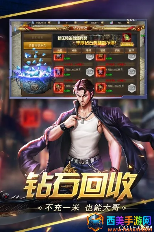 3. 福利丰厚诱人:充值比例1元:1000金刚石,随机充值券、福利材料、免费爵位上线就送;上线直接送超强神器、切割、材料、随机充值卷;成长奖励让玩家更省心;材料兑换功能能让玩家一直玩。