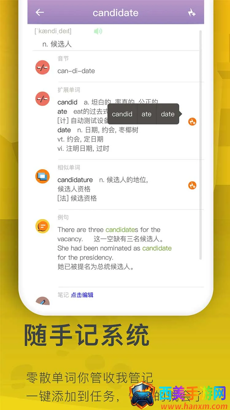 3. 科学记忆:运用艾宾浩斯记忆曲线,配合优秀算法,背单词更具效率。还有强大的整理收集查询系统,笔记随背随看,想找就有。