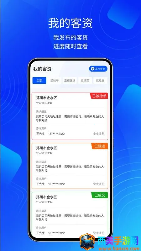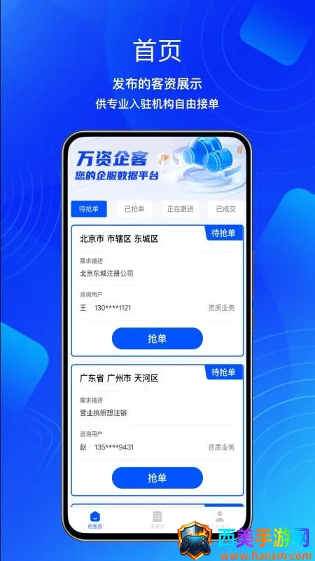 万资企客最新手机版是全国企业工商税务服务平台软件,提供专业企服数据。能一键发需求、发布客资,实时展示客资信息助力机构接单。支持查看客资进度,还有丰富客资、自由接单等特色优势。