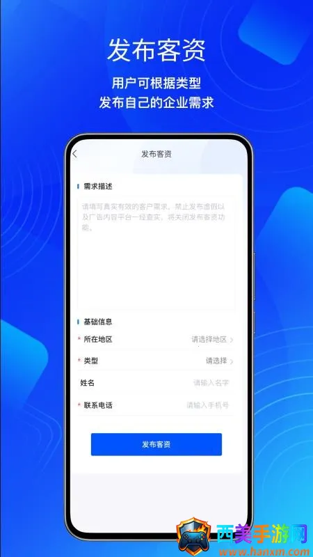 这款软件为用户提供了专业的企服数据,能让你一键发送工商或者税务的需求,根据类型实时发布企业需求,快捷发布相关客资,进而轻松发布出去,实时跟进成交。平台会对发布的客资信息实时显示,助力专业入驻机构自由接单,接到更多订单。此外,软件支持用户实时查看客资进度,全程跟踪掌握,更好地成交订单。如果你有相关需求,不妨来本站下载使用,体验其带来的便捷与高效,轻松对接商机,掌握客资动态,实现更多业务成交可能。