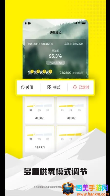 3. 多样吸氧模式:自由选择使用,并能轻松调节,还可自定义设置时间使用,到时间自动停止,免除频繁控制麻烦。