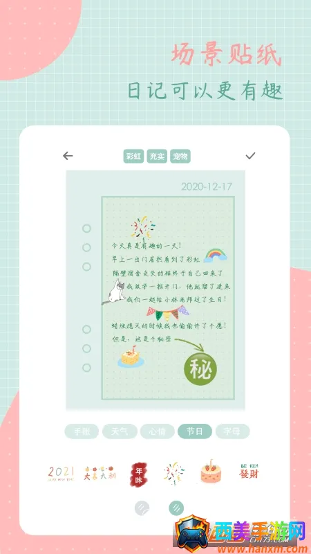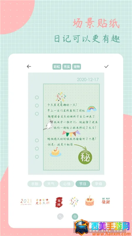 丰富多样的贴纸:拥有多种场景贴纸,生动活泼,为日记提供更丰富多彩的展现形式,有些话还能用画说,轻松让日记变得更有趣。