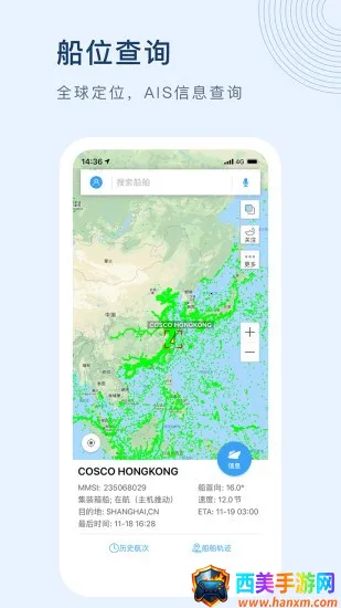 1. 船舶位置精准查询:通过船名、呼号、IMO、MMS等,可快速定位全球任意船舶,还能随时查看其位置变化,在全球电子海图上轻松掌握船舶动态。