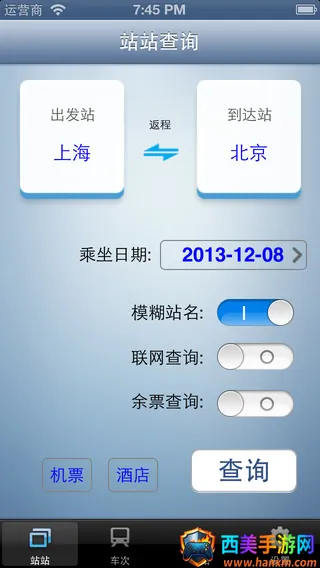 功能多样:支持站站查询、车次查询、按日期查询等多种方式,简便的站名输入可快速准确输入站名,还能将查询信息短信发送给好友。