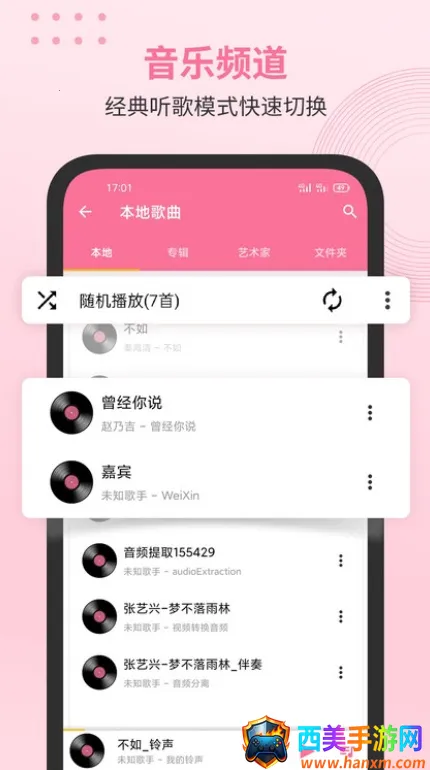 它能自动检测手机中的音乐文件,添加到播放列表,省却手动添加的麻烦。兼容MP3、MP4等流行音乐格式,随意播放。独特音乐解码技术改善音质,提升视听享受。提供单曲循环、顺序播放、循环列表及随机播放四种模式,还能自定义主题、歌词颜色,自动缓存清理,有歌曲剪辑和自定义铃声设置等功能,让个性与音乐完美融合,带来极致音乐体验。