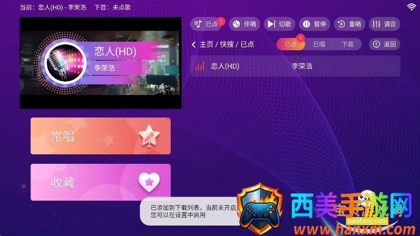 4. 操作简单,搜索歌曲方便,点击后自动下载,已点歌曲一目了然,还能设置点歌类型及快速调音,让K歌更加个性化。