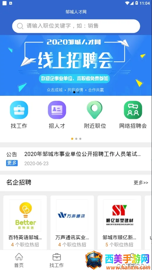 如果你正在邹城找工作,或者想了解济宁机器人产业园相关的招聘信息,那邹城人才网这款手机招聘软件就太适合你啦!它提供海量应聘岗位,公司和企业能在此发布招聘信息。这里职位搜索超方便,近十万个职位随手搜,总能找到适合你的。还有招聘会,现场招聘会和网络招聘会提供更多就业机会。不管是全职打工、兼职假日临工,都能免费帮你找到合适工作。应届生专区有职位、校园宣讲会和校园双选会,助力职场起步。软件特色多多,智能推荐高薪热门职位,精细筛选可按各种条件找心仪岗位,还有求职攻略提供就业指导和面试技巧。而且它全新的校园招聘模块有更多精选企业和职位,名企网申搜索功能强大,能通过关键词找工作。快来下载邹城人才网app,轻松开启求职之旅吧!