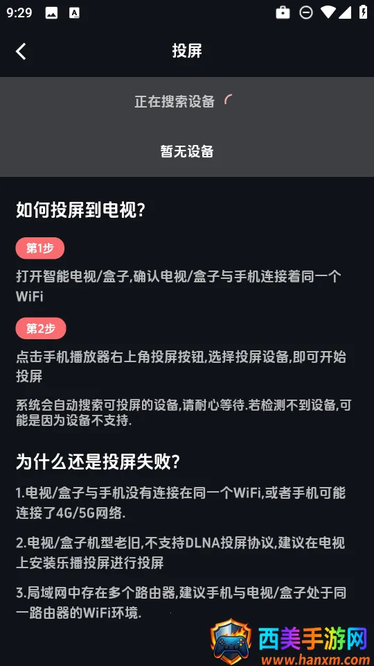 3、然后确保手机和投屏设备在同一wifi下,系统会自动搜索可投屏的设备,请耐心等待.若检测不到设备,可能是因为设备不支持。