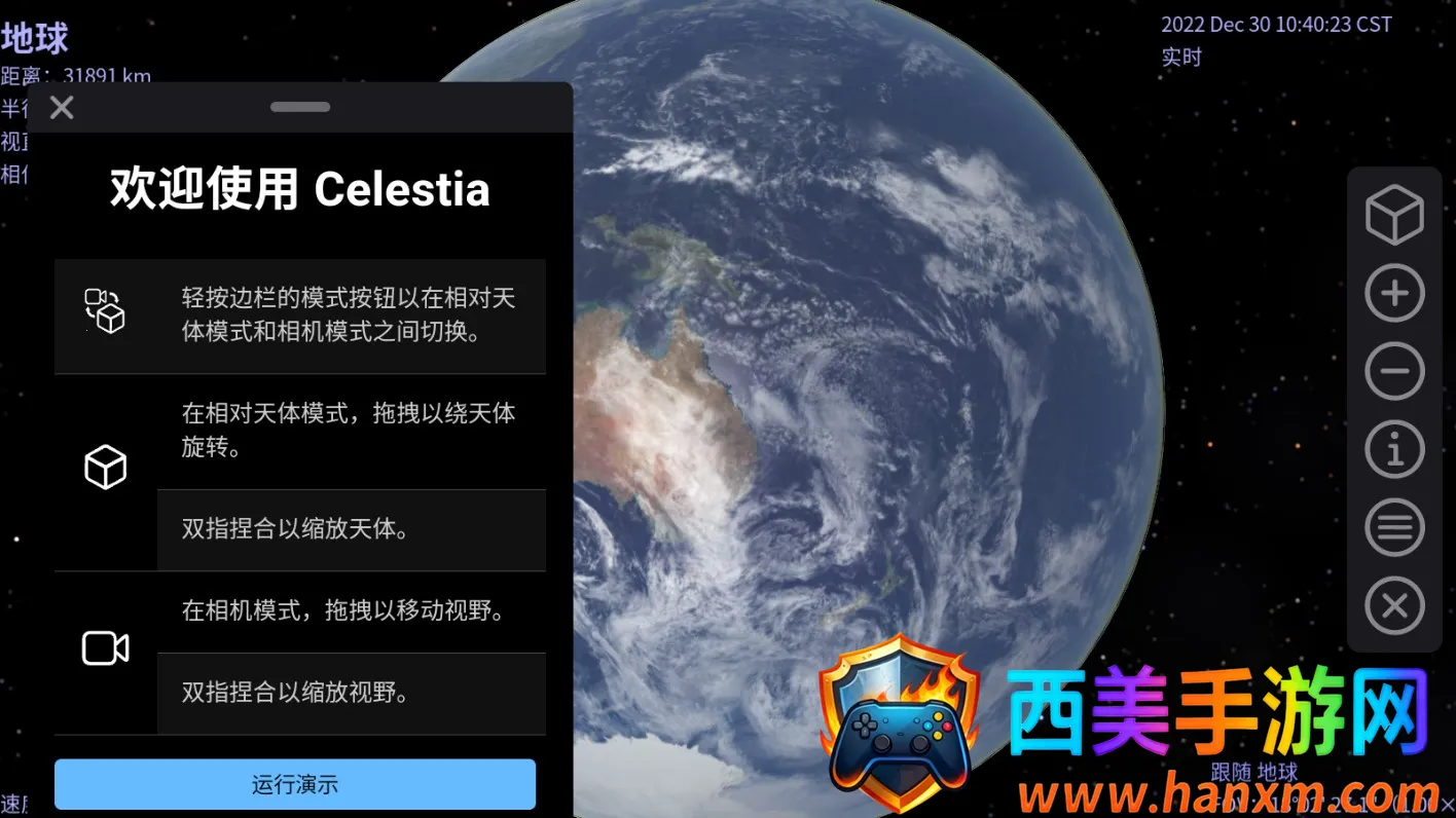 Celestia是一款超有趣的3D天文模拟软件。它能解决你对宇宙天体认知的诸多需求。软件功能强大,采用模块化设计,内置超10万天体数据,位置精度达毫秒级。能动态渲染太阳系及深空天体,支持任意视角缩放旋转,呈现真实运动轨迹。天文馆模式支持星图叠加,适配多种观测方式。你可导入喜欢的天体模型,从第一视角感受深空天体运动,还能降落于行星卫星表面。它有多种飞行模式,如自由飞行、跟随等。通过时间加速控制,能直观演示日食等天文现象。其多语言科普体系,点击天体触发中英双语百科词条。跨平台数据同步,方便在不同设备上延续观测创作。有了Celestia,在家就能轻松探索浩瀚宇宙,满足你对天文的好奇与探索欲。至于“Celestia”的读音,大概是 /s?lest??/ 。