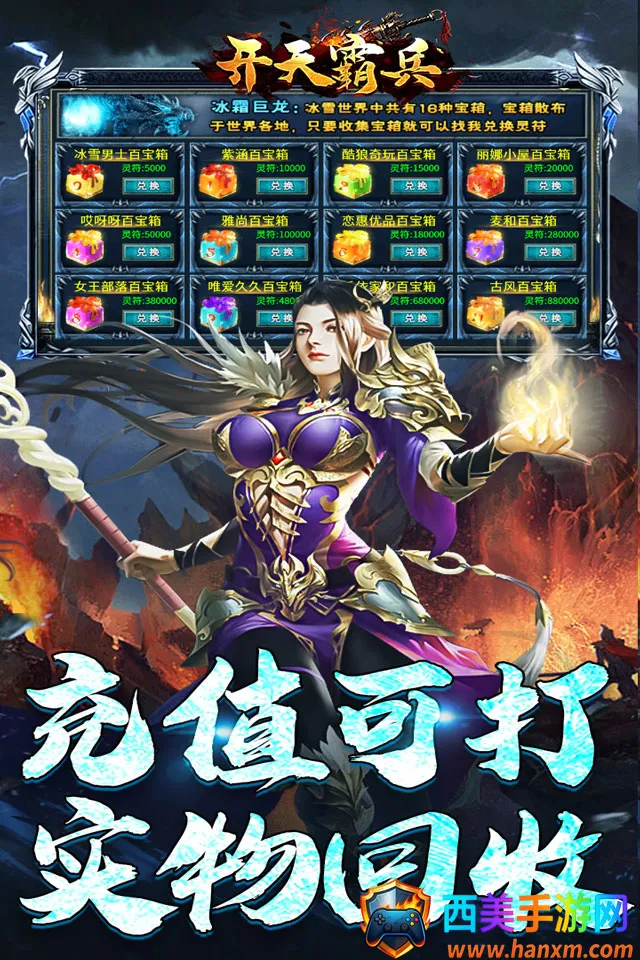 开天霸兵(传奇游戏福利多)是全新高福利沉默专属神器版本传奇。上线送自动回收等,1:1000充值比例,福利回收能赚真充领通宝。有超划算成长计划等特色,多元组队、PK无限制,节假日有专属福利,还有多种礼包领取方式。