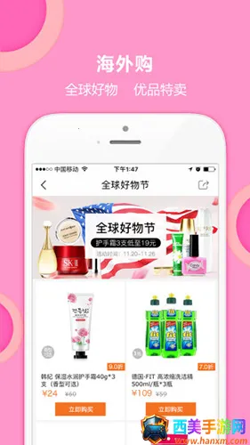 - **特色功能**:包括居家百货、优选特卖、限时秒杀、全球海淘等。