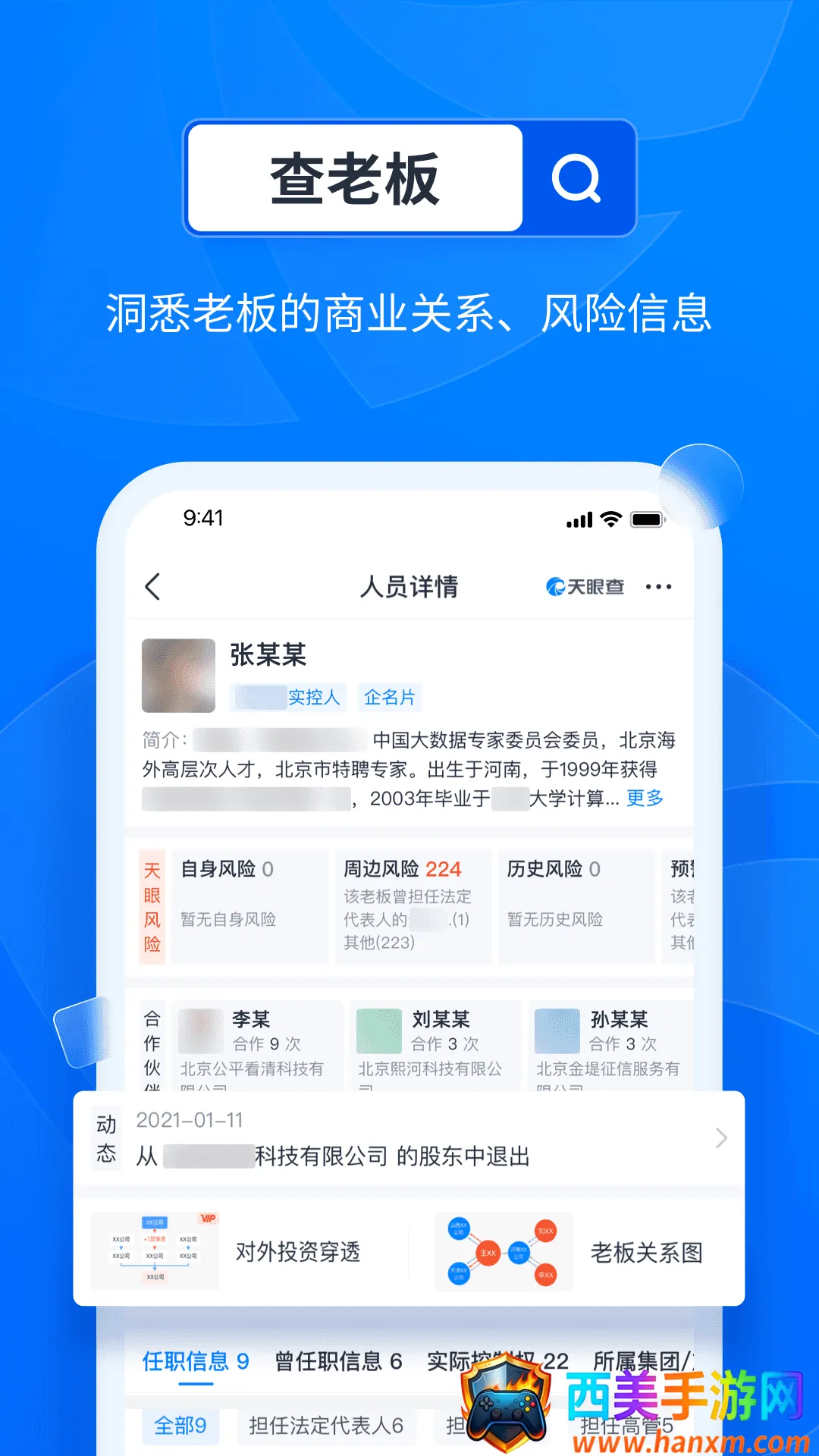 天眼查是一款超棒的企业信息查询软件。它能快速查询各类企业的详细信息,像基本资料、法人股东信息、经营状况、信用评级等都能查到,还能进行风险预警,帮你及时发现潜在风险。它基于2.5亿关系链,能深度挖掘关系,支持多终端分析展示,随时随地满足你的搜索需求。数据可视化呈现关联关系图谱,超8000万企业信息全免费查询。已覆盖国内9000多万家企业,信息与国家权威网站同步实时更新。告别繁琐注册登录验证码限制,简单输入公司名称或字号就能查。能帮你全面洞察商业价值,规避风险,高效进行背景资料搜集、商务洽谈、业务合作、尽职调查等。无论是找工作、投资融资还是合作,它都能提供丰富全面客观权威的企业信息,让你轻松了解企业状况。