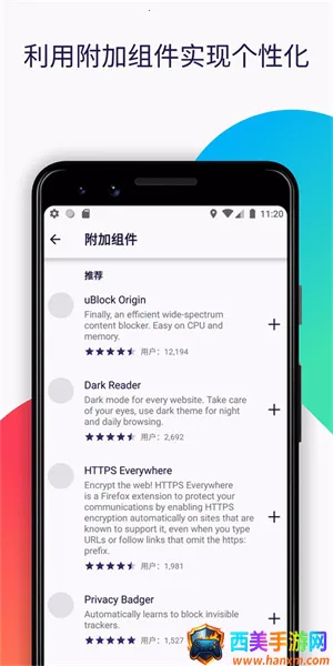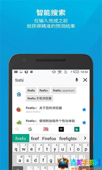 火狐浏览器手机版是一款出色的移动浏览器。它由Mozilla公司开发,全平台可用,拥有高效智能引擎,能快速搜索和跨设备同步数据,网页加载速度极快,内存占用比Chrome少,确保浏览顺畅。其隐私浏览模式退出时自动清除Cookie数据与浏览历史,保护用户隐私。还支持自定义工具栏,用户可按需求添加或删除功能按钮。它支持拓展插件安装,像uBlockOrigin等知名插件都能添加,能有效屏蔽广告,提升安全实用性。在安全性与隐私方面表现出色,内置完整隐私和安全工具,还支持多设备同步,能在手机、电脑等设备间无缝切换浏览,带来便捷高效的上网体验。
