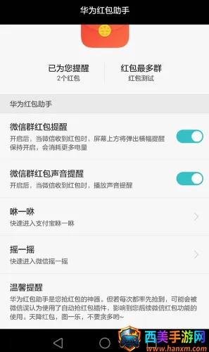 华为红包助手能帮你轻松设置红包提醒。它支持微信、QQ等社交平台红包的实时监测。当有人发红包时,会给出横幅声音提醒,让你不会错过任何一个红包。设置方法很简单:先打开微信群的群设置,将消息免打扰打开,同时通知显示消息详情也要打开。这样,微信群里有人发红包,华为手机红包助手就会提醒你抢啦。它稳定性强,由华为公司开发,抢红包时不会闪退或卡顿。还能快速响应,实时监测红包信息并迅速推送。除了红包提醒,还有红包记录、统计等实用功能。有了它,自动抢红包也很方便,设置好相关数据,就能自动抢,无需手动操作。专为华为手机用户定制,能与手机操作系统深度融合,智能识别红包链接,提高抢红包成功率,让你轻松享受抢红包的乐趣。