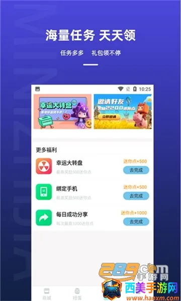 迷你之家是厦门胜吴电子商务有限公司开发的游戏福利领取软件。做任务、邀好友获积分,可换和平精英和迷你世界皮肤。有集卡兑换、幸运抽抽等玩法,能领海量礼品,还可了解游戏资讯攻略 。