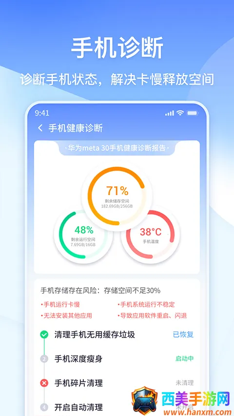它能让手机运行更流畅,一键清理快速解决空间不足问题。**内存加速**独具毫秒级加速,告别卡慢。还有强力的**软件小马达**,带来极致娱乐体验。**隐私粉碎**清理无痕,保护隐私。**超级加速**免root关闭后台,强效加倍。**自启管理**延长续航,杜绝软件偷跑。**软件卸载**能搞定无良预装。**照片省空间**,智能优化节省80%空间,全方位满足手机清理需求。