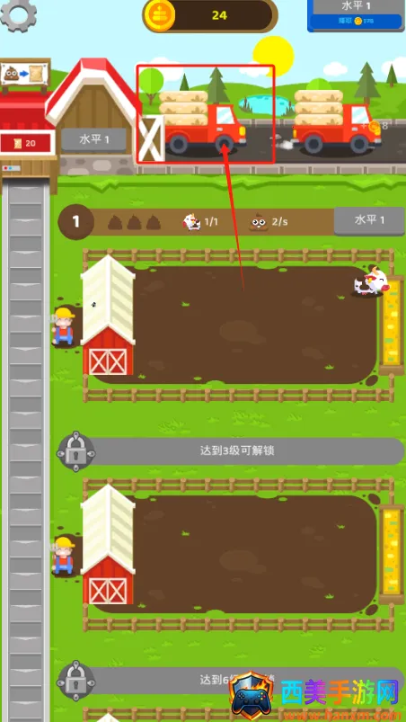 2 升级农场设备和动物种类以提高产量与效率,解锁更多动物如牛、猪乃至鱼塘中的生物。