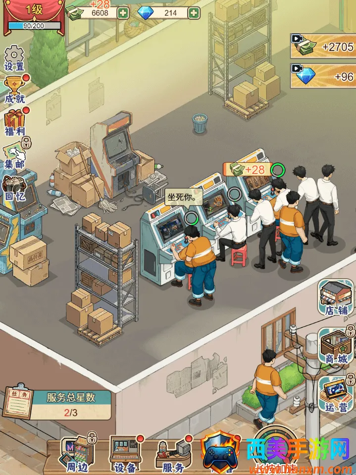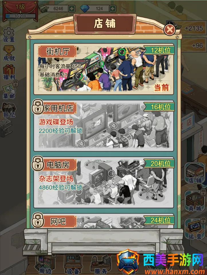 通过优化经营策略,一步步壮大铺子版图,升级设备、引入稀缺卡带、解锁特殊剧情,让店铺从狭窄小巷铺子升级成综合性游戏厅。
