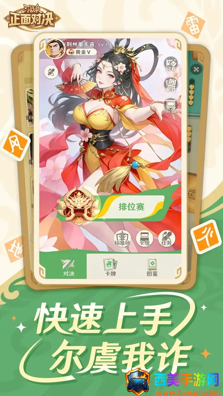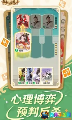 想体验刺激的三国卡牌对战吗?那就来看看《三国杀正面对决》吧!这是一款三国题材的轻社交快节奏卡牌对战游戏。在这里,你能自由组建卡组,在三条交战区布阵交锋。通过巧妙部署角色、运用锦囊妙计,再加上随机天命事件,感受智力博弈的乐趣。游戏节奏明快,上手容易但精通不易,不仅有牌局对弈,更有精彩的心理博弈。每一局都充满变数与惊喜,让你仿佛置身于真实的三国战场。不管你是卡牌游戏新手还是资深玩家,都能在《三国杀正面对决》中找到属于自己的三国对决乐趣,快来开启这场精彩的卡牌对战之旅吧!
