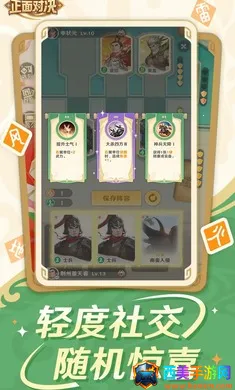 三国题材的卡牌对战游戏别有一番风味。它是轻社交快节奏的类型,玩家能自由组建卡组,在三条交战区布阵交锋。通过角色部署、锦囊妙用以及随机天命事件,感受智力博弈的乐趣。游戏节奏明快,上手容易但精通较难,不仅仅是牌局对弈,更是心理博弈。每一局都充满变数与惊喜,能让人沉浸在三国对决的独特魅力之中。无论是喜欢策略对战还是享受智力比拼,它都能带来独特体验,让玩家在三国世界里尽情展现智慧与谋略,享受一场又一场精彩的卡牌对战盛宴,是一款值得尝试的卡牌游戏。